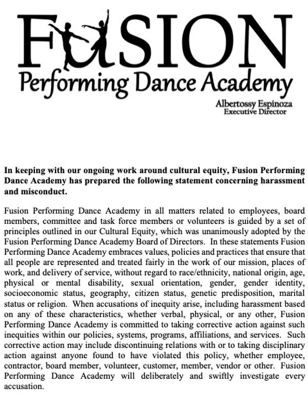 Fusion Performing Dance Academy (Fusion) acknowledges the acute need to remove barriers to the recruitment, retention, and advancement of dance groups, dancers, choreographers, and administrative/management staff from historically excluded populations who are currently underrepresented in the dance field. Through its ongoing work, Fusion will realize its full aspirations to be a haven and achieve its goals of representation and accountability.