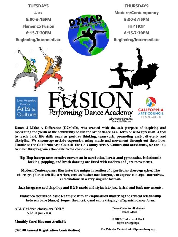 FUSION Performing Dance Academy (FPDA) is a 501(c)3 not for profit organization offering the gift of dance and fitness classes to under served children and adults in the East Los Angeles and City of Commerce communities. With a professional staff and a high-energy atmosphere, FPDA provides comprehensive and personalized dance training to both the recreational dancer as well as the aspiring professional. We encourage the following goals for all our students: Character Development, Self-Confidence, Leadership, and Creative Expression.